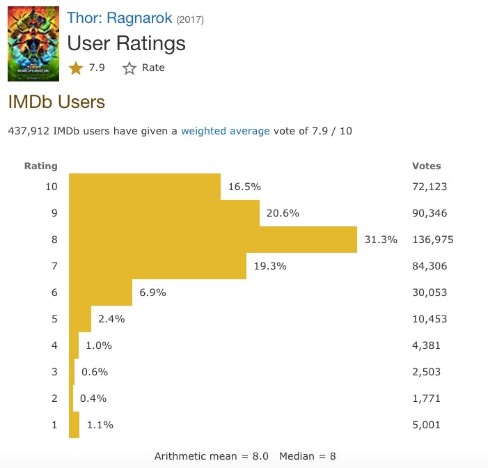 Captain Marvel was the subject of review bombs on sites such as IMDB and Rotten Tomatoes, which are popular sites for review movies. Review bombing is when films or television shows are given negative reviews before its release, by those who have not seen the film, in order for it to have a worse average review (Adekaiyero). While many critical reviews are valid, much of the ones for this film came before the film was even released. IMDB ratings of 1 stars were around 4,943 and the 10 star reviews were at 4,461 with a weighted average of 6.1/10 which shows a significant discrepancy in the IMDB ratings for this movie, not seen with any other MCU film to date (IMDB). Many of the 1 star reviews before the film’s release commented on the “feminist agenda,” “SJW,” and “politically correct” aspects they felt the film portrayed (Francisco). The ratings by demographic also shows a startling contrast. On average, women scored the film at 7.4 stars while men rated it a meager 6.8 stars across multiple age groups according to IMDB. Other male-led superhero films, such as 2017’s Thor: Ragnarok shown below with a weighted average of 7.9/10, have not seen these discrepancies before. It can only be assumed, certain audiences did not appreciate that the film was led by a powerful female superhero, the first of her kind in the film franchise.