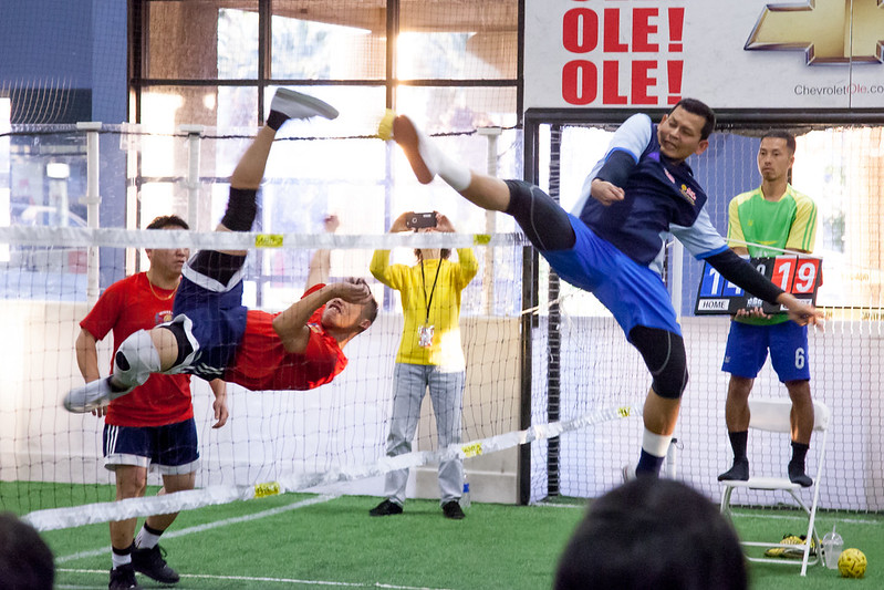 The court is similar to badminton – small. There can be two to four players on each side (three players is more mainstream), and they’re allowed to hit the ball three times – one player can take all three hits if needed. Players can use their heads, chest, back, and legs. No hands! When serving, two players are beside the net in their quarter-circles. The serving player is in a small circle behind them. They’re placed like a triangle. Once the server kicks the ball across the net, they can break formation and play.