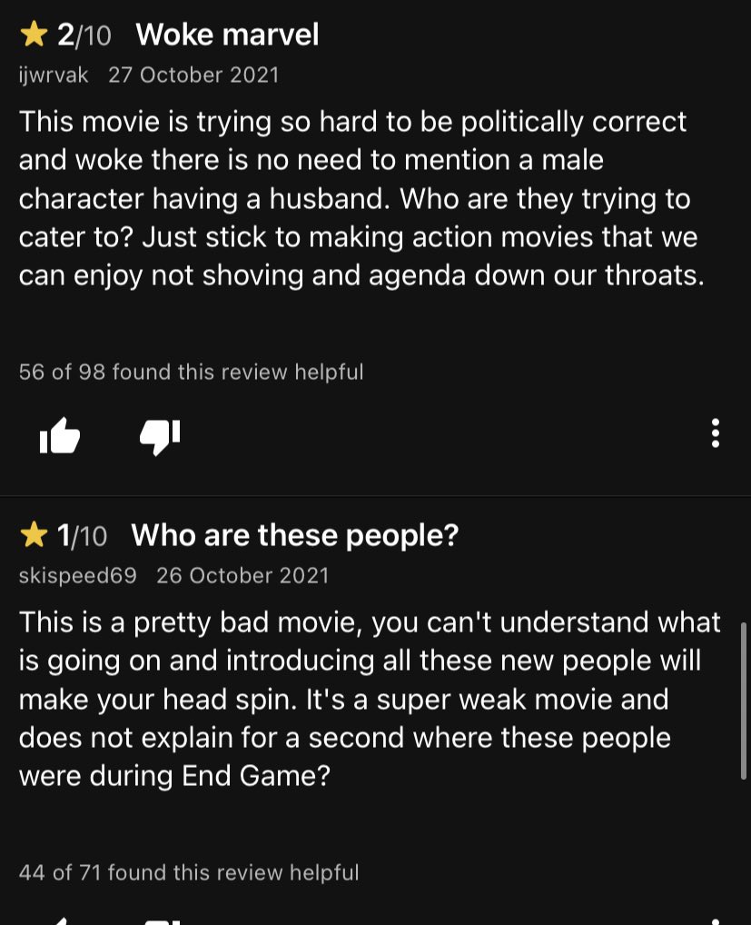 Diverse films are typically the targets of these review bombs because of the diversity in race, ethnicity, disabilities, sexualities, and much more. This works to lower the ratings of the film due to negative and critical reviews so moviegoers choose not to watch it (Adekaiyero). This has been a recent trend in blockbuster films that have cast women or people of color as leads such as Star Wars: The Last Jedi and Captain Marvel. These are the most recent examples with many giving negative reviews because the Last Jedi featured a Black man and Asian women as some of the main leads while Brie Larson as the lead for Captain Marvel. With The Eternals, of the over 400 1-star reviews, such as the ones featured below, many cited the LGBTQIA+ representation and on-screen kiss as a reason for the low rating on places like Rotten Tomatoes and IMDB (Collington). Many of the 26.1% 1-star negative reviews were not based on criticism of the plot, the characters, or any relation to the real merits of the film. Most of it came from the uncomfortableness at seeing such diversity in a massive, big budget film with a notoriously white-dominated franchise like Marvel. Through personal experience from seeing the film, the uncomfortable silence did not come during Marvel’s first sex scene between the main male Eternal Ikaris and female Eternal Sersi, but when our gay, Black Eternal, Phastos, shared a loving, intimate kiss with his husband. People are not accustomed to seeing what would be considered bold LGBTQIA+ scenes in superhero films.